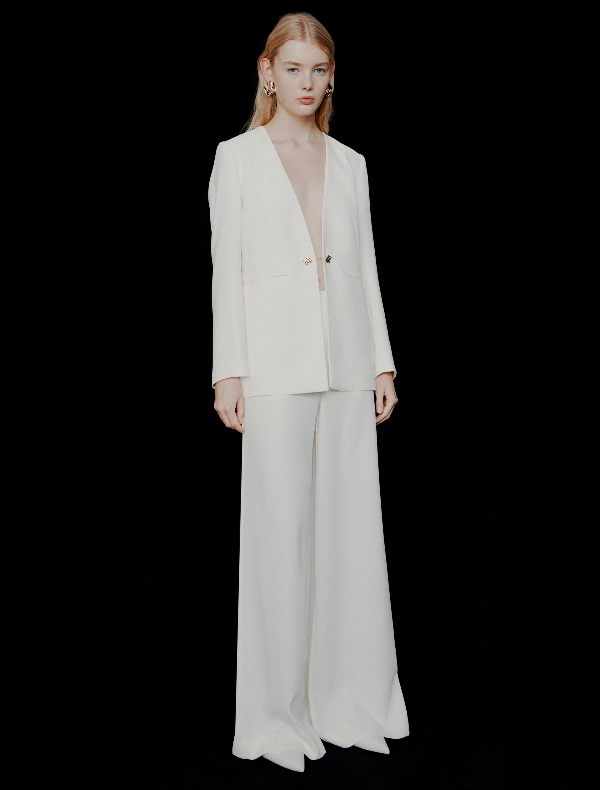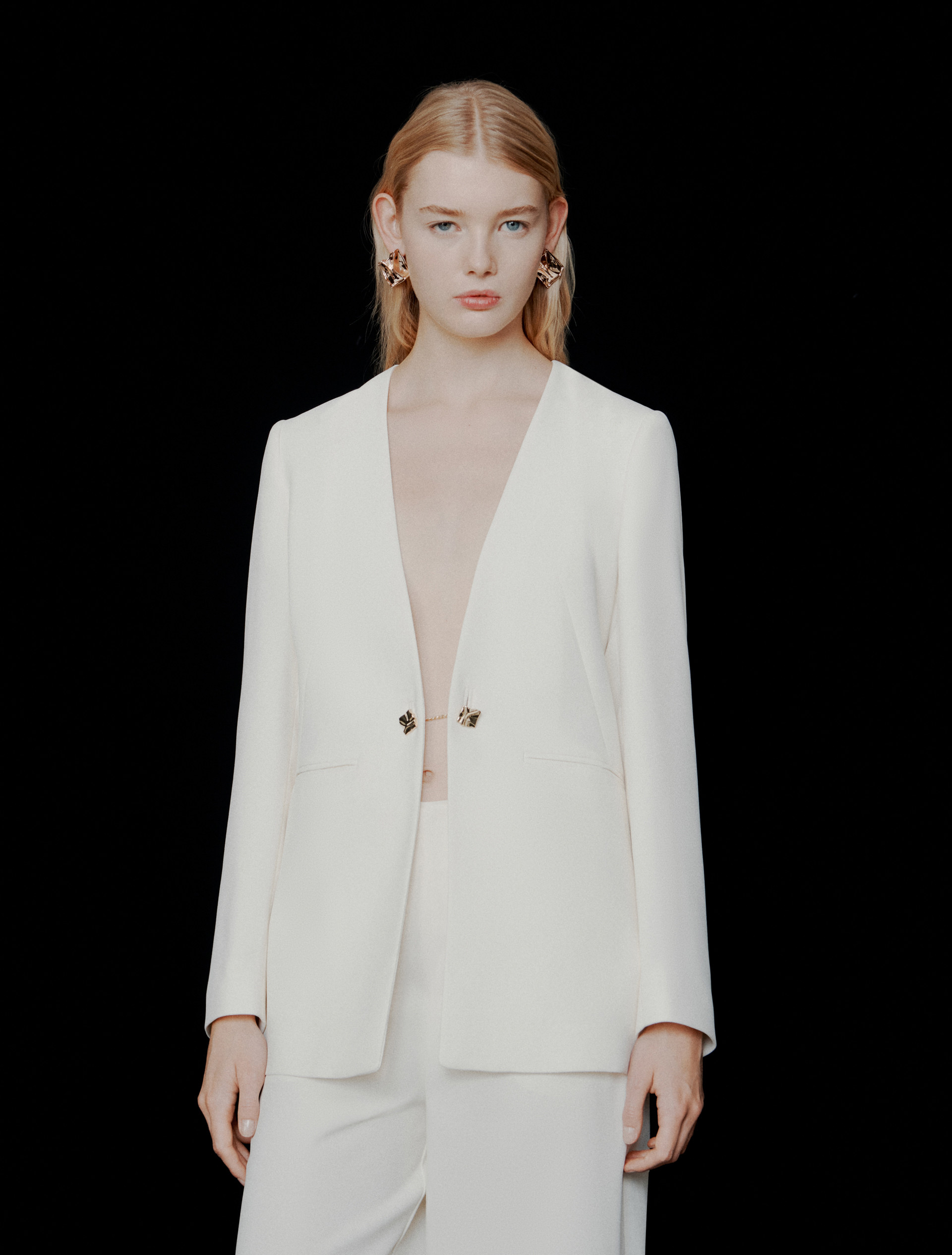 Aktualisierte Interpretation des einreihigen Blazers aus Crêpe-Gewebe, das die Silhouette fließend umspielt. Der kragenlose Schnitt und der Verschluss mit einem Doppelknopf, der wie ein Schmuckstück wirkt, runden den Look ab und verleihen ihm eine raffinierte Note.